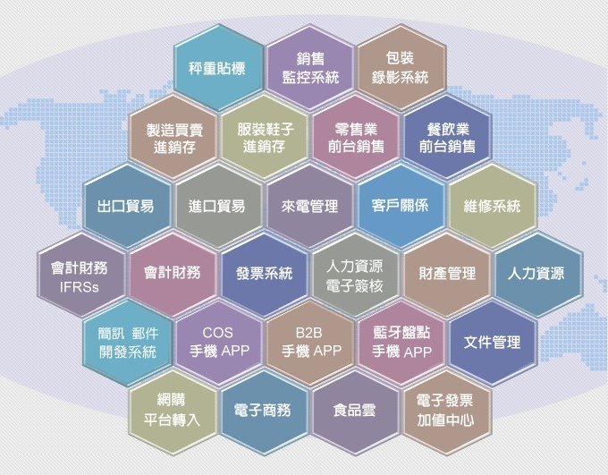 APP-B2B介紹 APP-COS介紹 IFRSs解決方案 進銷存介紹 會計軟體介紹 POS介紹 POS餐飲介紹 人事差勤介紹 維修系統介紹 業務開發介紹 來電監控介紹 出口貿易介紹 財產管理介紹 發票系統介紹 雲端,網頁庫存查詢