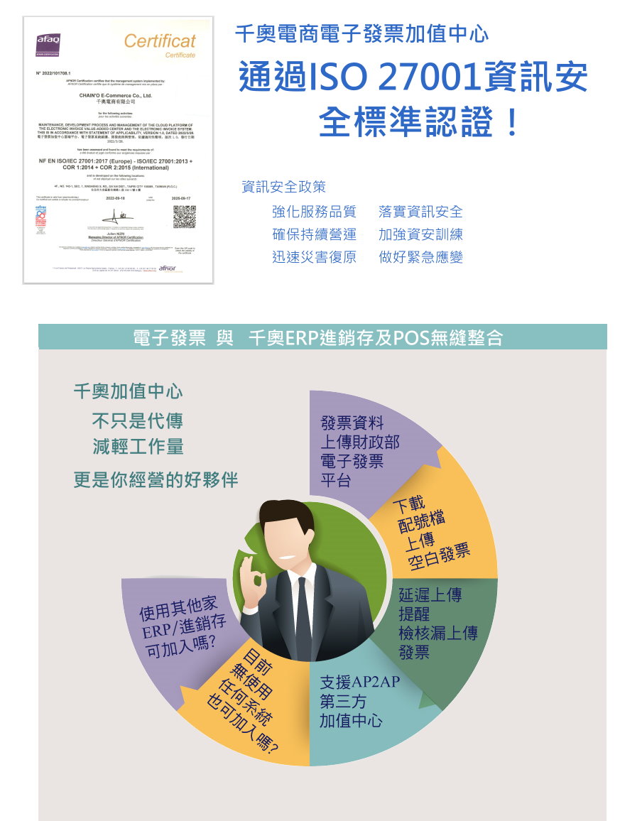 資安承諾與政策千奧電商有限公司(以下簡稱「本公司」)鄭重宣告:我們已建立、實施並維護符合 ISO/IEC 27001:2022 國際標準的「資訊安全管理系統」(ISMS),並通過 AFNOR 法國標準協會 獨立稽核認證(證書編號:N° 101708.1)。此認證彰顯我們對資安最佳實踐的承諾。 ▍ ISMS 適用範圍本系統涵蓋:千奧電商有限公司 所有業務活動,包括電子發票加值中心雲端平台、客戶服務與資料處理。此範圍確保我們的核心業務活動均符合國際資安標準要求。 核心資安承諾機密性嚴格防止未授權存取或洩露敏感資料,實施加密與存取控制,確保客戶數據與商業機密安全無虞。 完整性確保資料正確性與一致性,防止不當篡改。透過數據驗證機制與版本控制,維持資訊完整可信。 可用性維持關鍵系統99.9%運作時間,保障服務不中斷。部署災難復原方案與即時監控,確保業務持續運作。 法規遵循千奧電商有限公司 遵循《個人資料保護法》等適用之法規與合約要求,定期進行合規審查,確保所有處理活動符合法律規範。 風險管理與責任架構風險管理機制透過系統化流程識別、評估資安風險,每季執行風險評鑑並實施管控措施。採用 NIST 框架分析威脅情資,動態調整防禦策略。 持續改善定期進行內部稽核與管理審查,每年通過第三方驗證。建立 PDCA 循環機制,持續優化 ISMS 以應對新型態威脅。 責任架構人員責任全體員工及合作方均有責任維護資安。我們採取以下措施: